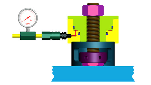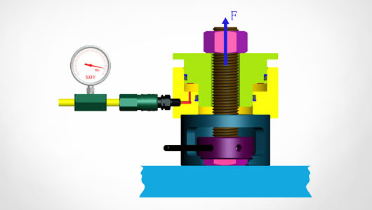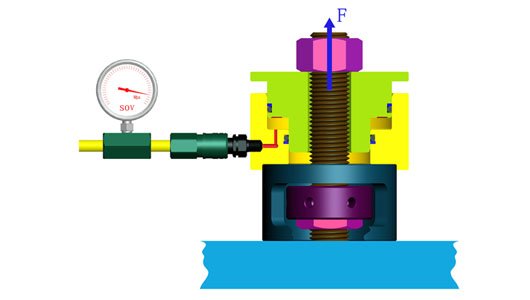 将液压螺栓拉伸器旋入螺栓。当开始增大液压压力后,油缸里的活塞开始上升,推动拉伸头向上移动,开始拉伸螺栓。