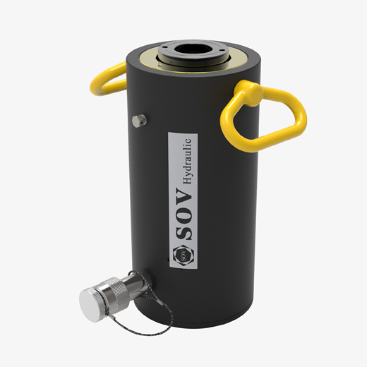 单作用中空柱塞液压千斤顶应用及其广泛,适用于加工、维修、牵引等作业。在需要牵引的作业中,特殊的空心活塞设计使牵引杆或钢索能够穿过整个油缸作业,在各种压合和机械牵引系统工作中,常用于向后牵引和向前挤压的作业。当装备有可互换的钢质强化活塞鞍座时,也能用于常规的举升作业。